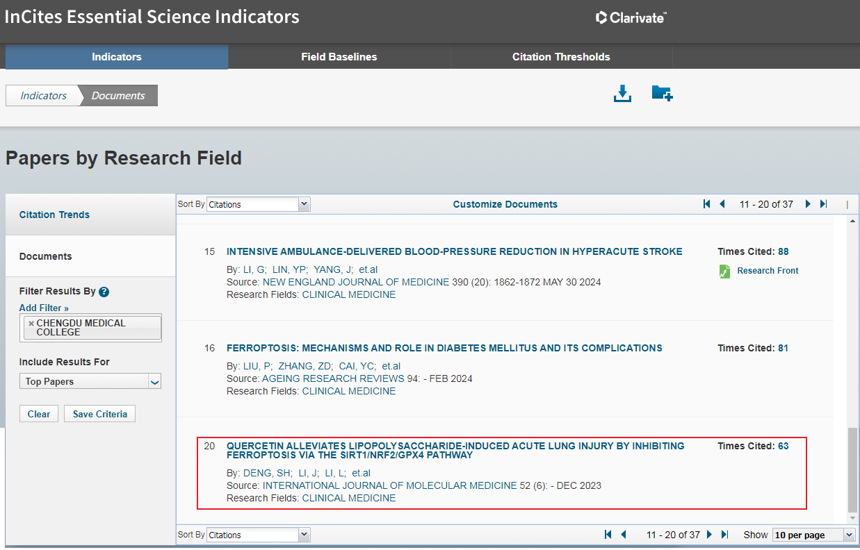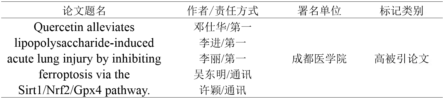 ESI数据库2026年3月数据显示,以成都医学院为单位署名的SCI论文新增1篇入选ESI临床医学高被引论文,详情如下。
