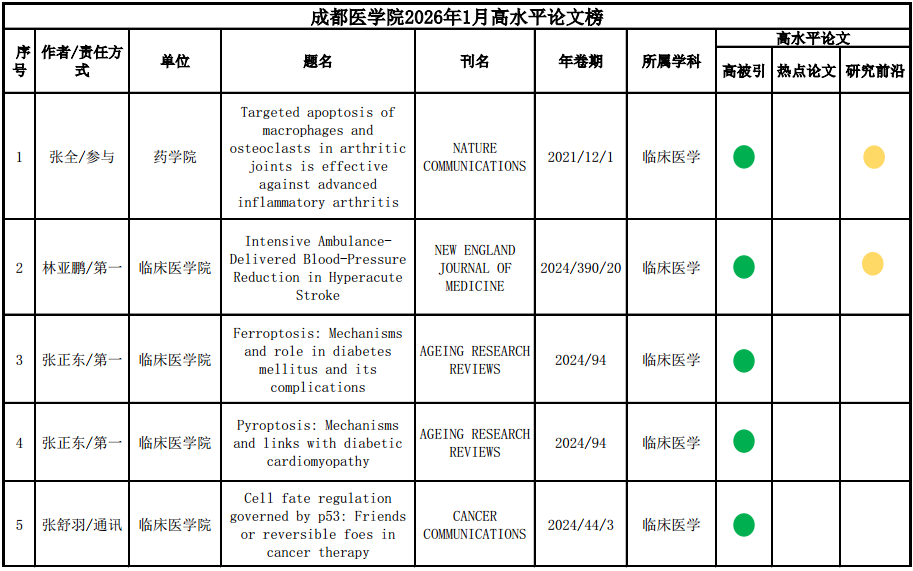成都医学院2026年1月高水平论文榜 发布人:信息服务部 发布时间:2026年01月12日 15:19 浏览次数:[] 因系统限制,图像像素受损,需要原图的老师可点击下方链接下载 2026年ESI-1月高水平论文榜单 相关信息 读取内容中,请等待...